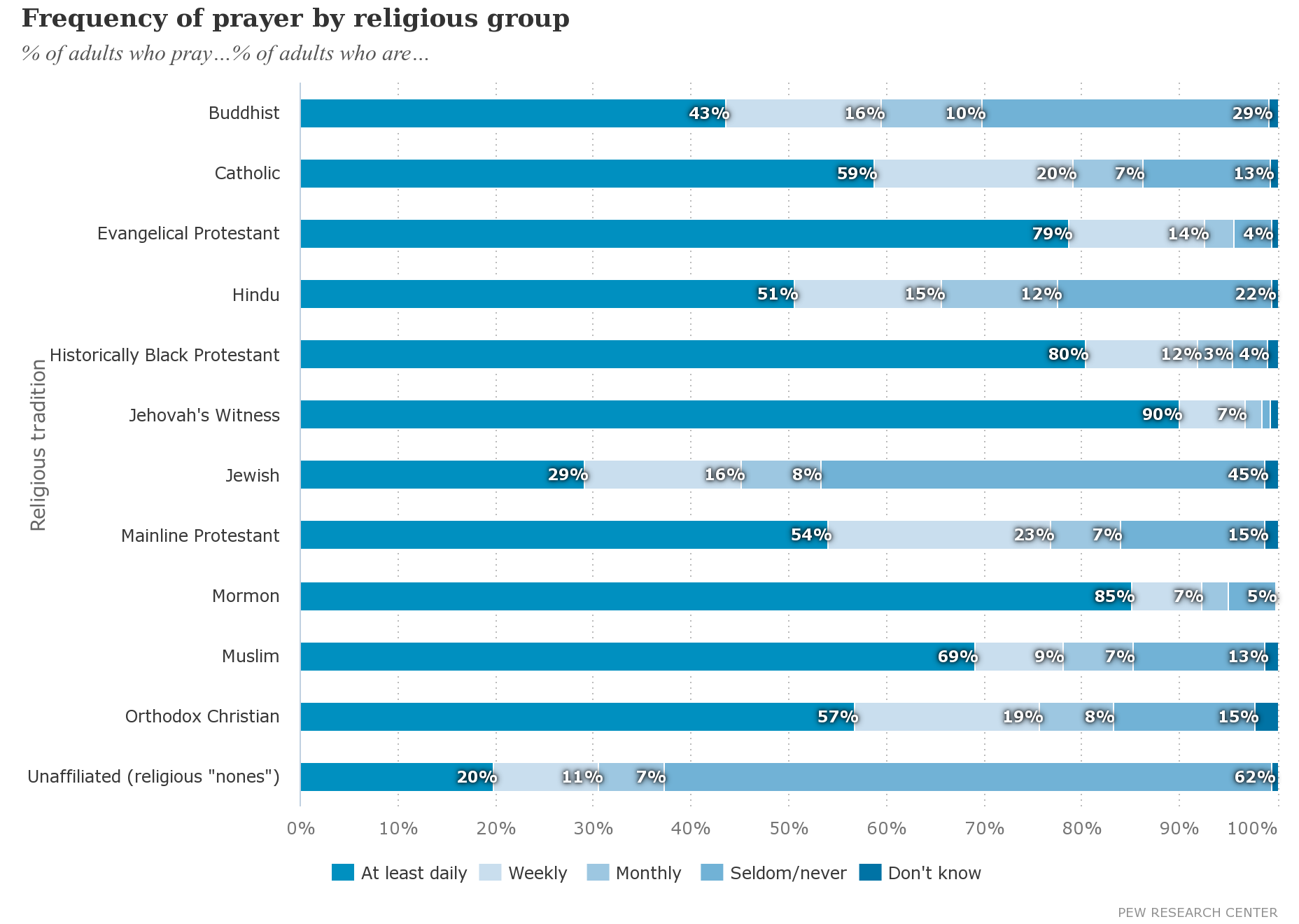 In 2014, a in-depth study was done on the praying life of Americans. 21% say they pray weekly or monthly and 23% say they seldom or never pray. Even among those who are religiously unaffiliated, 20% say they pray daily. 45% of Americans — and a majority of Christians (55%) — say they rely a lot on prayer and personal religious reflection when making major life decisions.