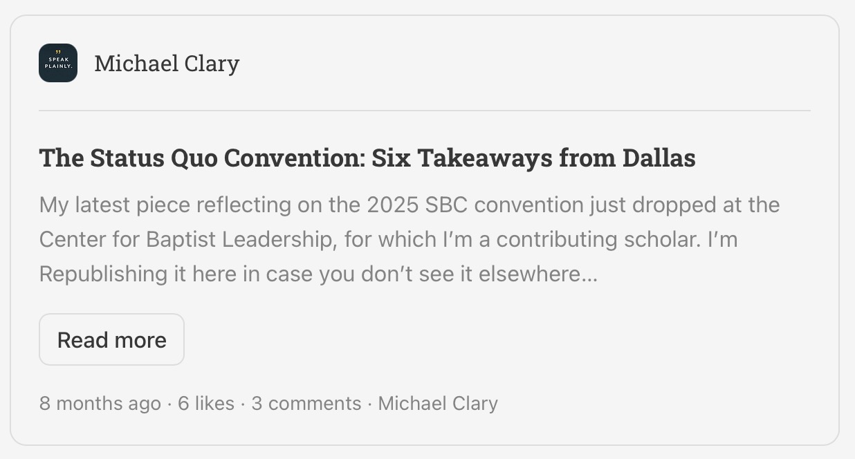Michael Clary wrote an excellent article about the 2025 Southern Baptist Convention here. He called this year’s meeting the “Status Quo Convention.” I don’t disagree.