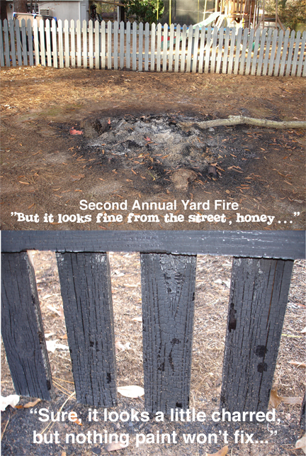 Some people have annual yard sales… we have yard fires. Or so Carolyn tells me. Actually, it’s been a few years since my last major yard fire. That was back in my PB days (pre-blog). Thank goodness. But suffice it to say, that the entire Monticello Fire Department, including volunteers in several monster trucks, showed up at our house on Tanglewood then to douse what I’d started. The yard (and neighborhood.. and forest behind our house) was saved.
