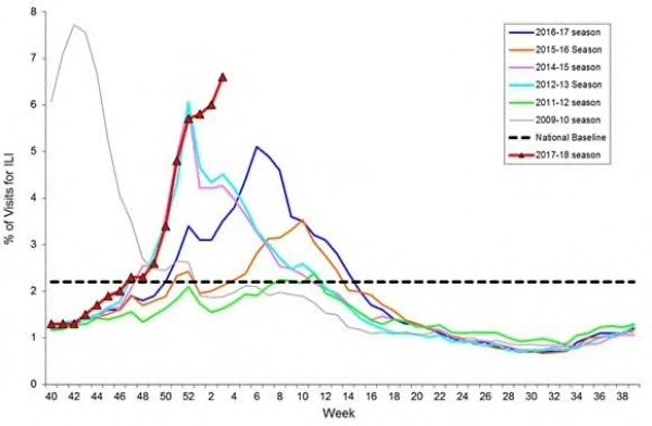 The heavy red line shows that this season has the highest percentage of people seeking care for flu-like illness since 2009-2010. (via CDC web) - Coughing. A productive cough is when stuff comes up and you feel better when you cough. An unproductive cough feels like raking your esophagus with steel wool, leaves you with a sore throat and nothing to show for it.