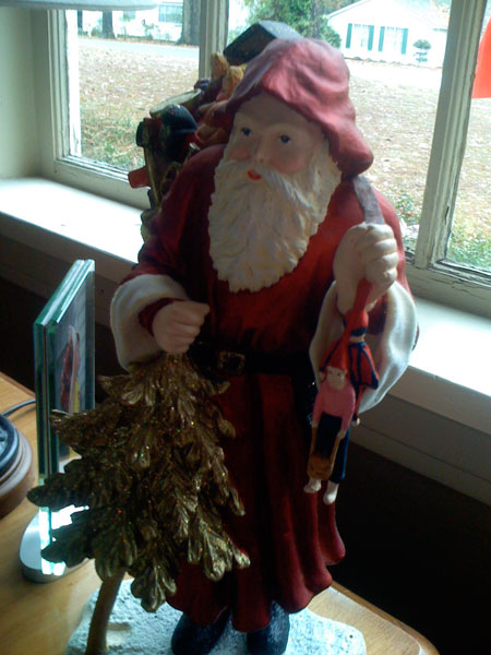 I was spending some time in scripture reading and prayer the other morning when I happened to glance over at the end table where my coffee mug rested. My eyes were somehow drawn to the ceramic Santa perched proudly thereupon. When what to my wandering eyes should appear but two tiny children dangling helplessly from his clenched fist…