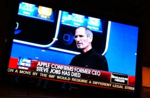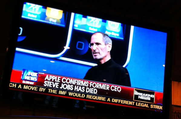 I was watching a movie, and Carolyn and the kids were in Little Rock when she texted me a picture of a TV with Fox News’ “breaking news” headline of “Apple confirms that Steve Jobs has died.”
