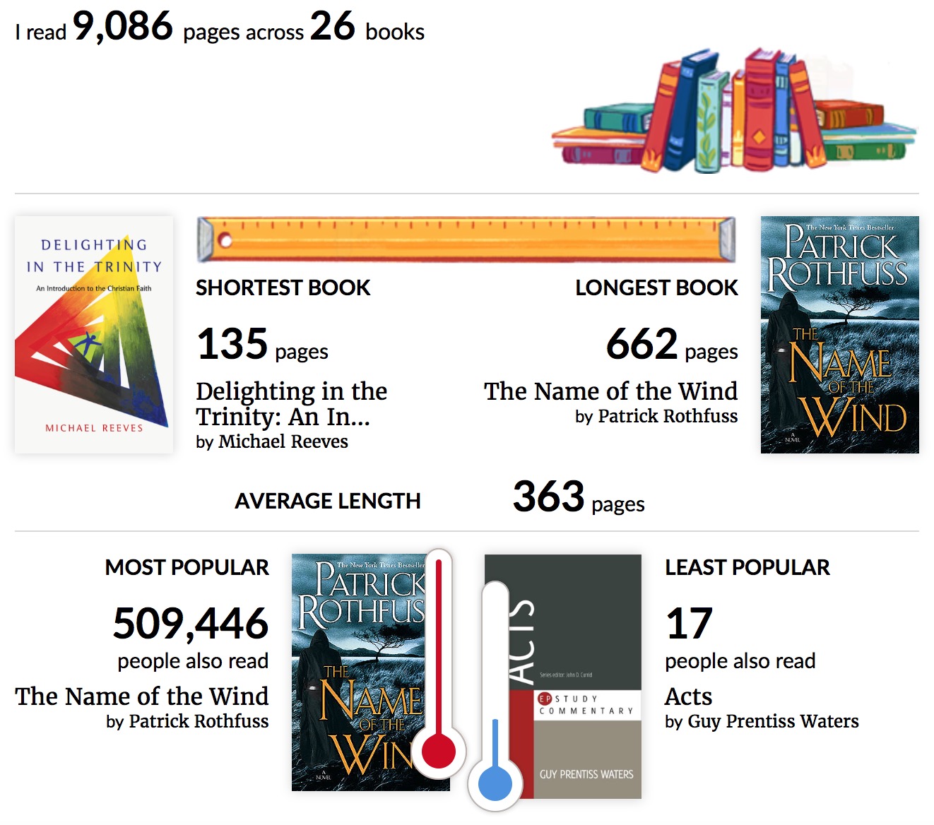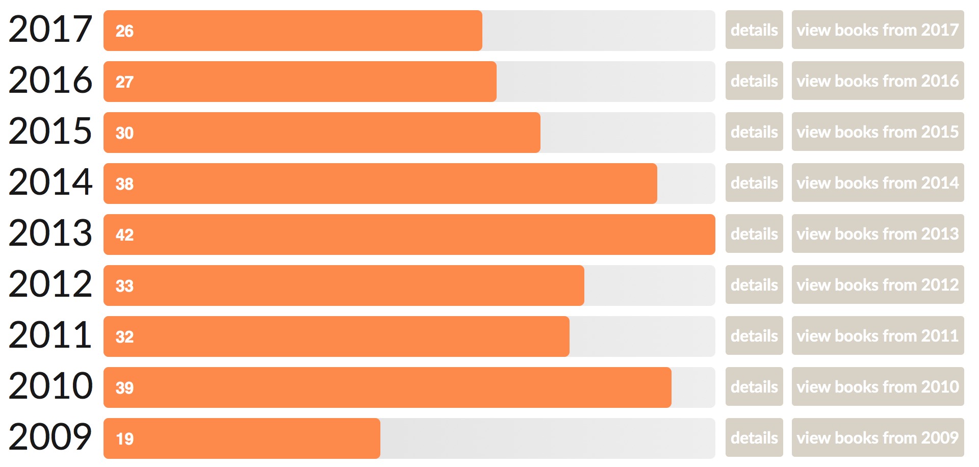 I read 26 books in 2017. That’s the fewest books I’ve read in a year in the past eight years, according to GoodReads, although I read more pages this year than last year (9086 vs 7494).
